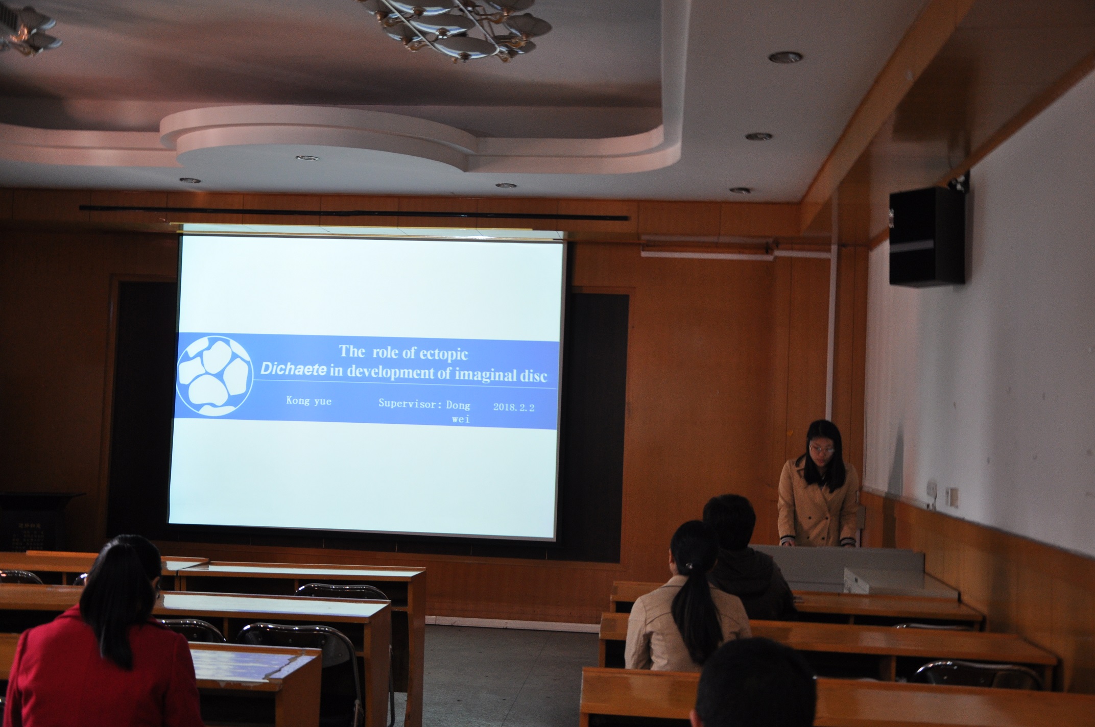 之后,姬亚男和孔悦同学分别就“几丁质脱乙酰基酶serpentine和vermiform基因对果蝇翅发育的影响”和“异位表达Dichaete对果蝇成虫盘发育的影响”的研究背景、实验进展和本学期的工作计划做了汇报。在座师生对两位同学的汇报进行了点评,并提出具体建议,对其下一步的研究工作具有重要的指导意义,也对低年级的同学起到了引导作用。