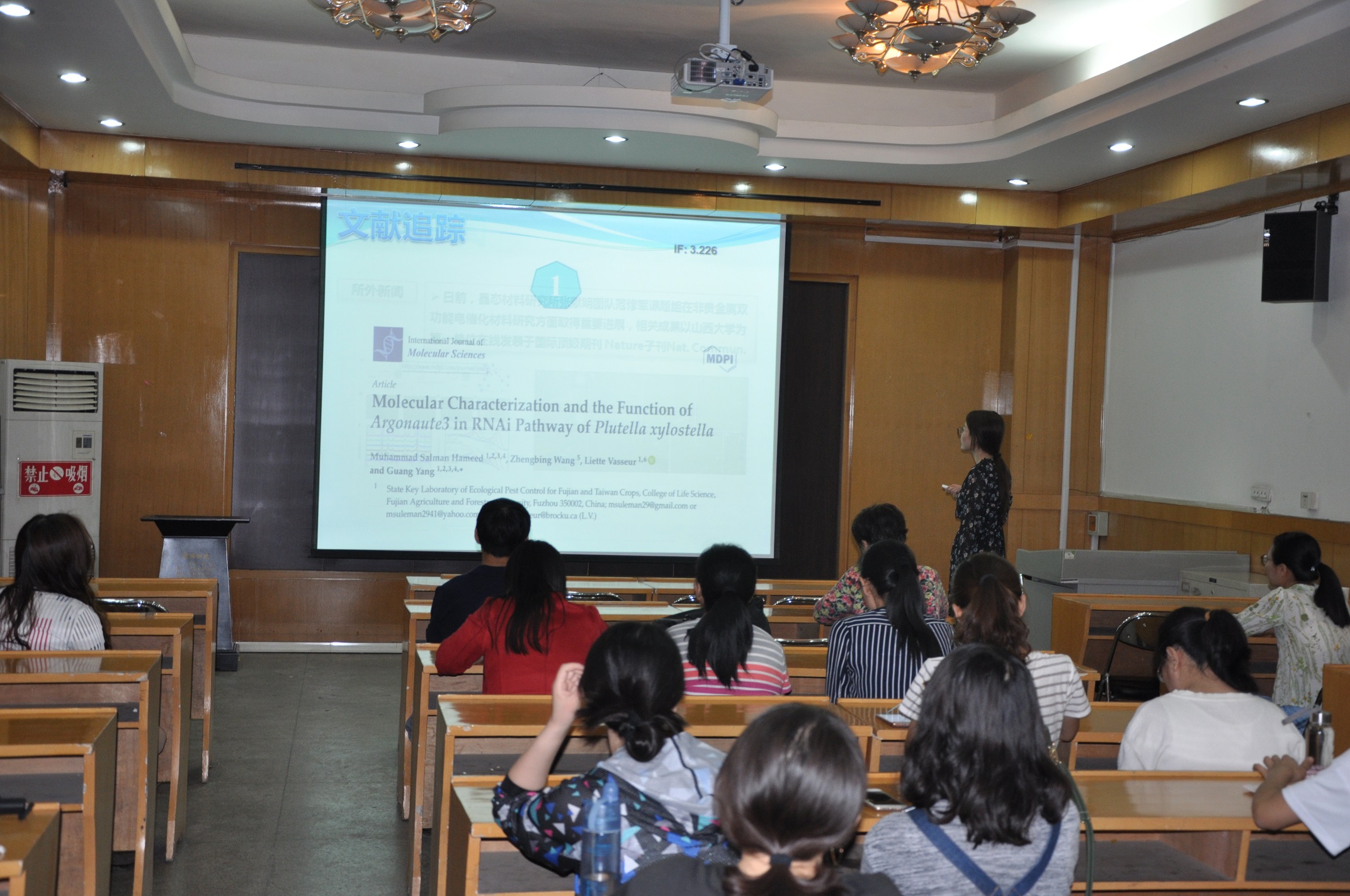 首先,张晶同学介绍了近期实验室内的重要新闻:2018年5月2日,我所成功举办第三次chalk talk研究生学术活动,此次活动中,由博士研究生史学凯讲解了RT-qPCR基本原理、实验过程及注意事项,大家积极参与,气氛轻松,学术氛围浓厚,各位同学收效颇丰;为了给大家营造良好的学习与工作环境,我所对405师生工作室进行了整理,增加了统一型号的书架,使工作室面貌焕然一新;我所也对农科院植保所实验室进行了整理,增加了实验台架,改善了实验条件;2018年5月14日,第一届国际生物防治大会在北京举行,我所李涛老师和Malik博士研究生应邀参加会议,通过参加会议,扩大与同行学者的交流,促进科研工作进展。此外,张晶同学还介绍了近期国内外本领域最新科研进展和发表于国际学术刊物、与本研究所研究内容相关的重要学术论文。