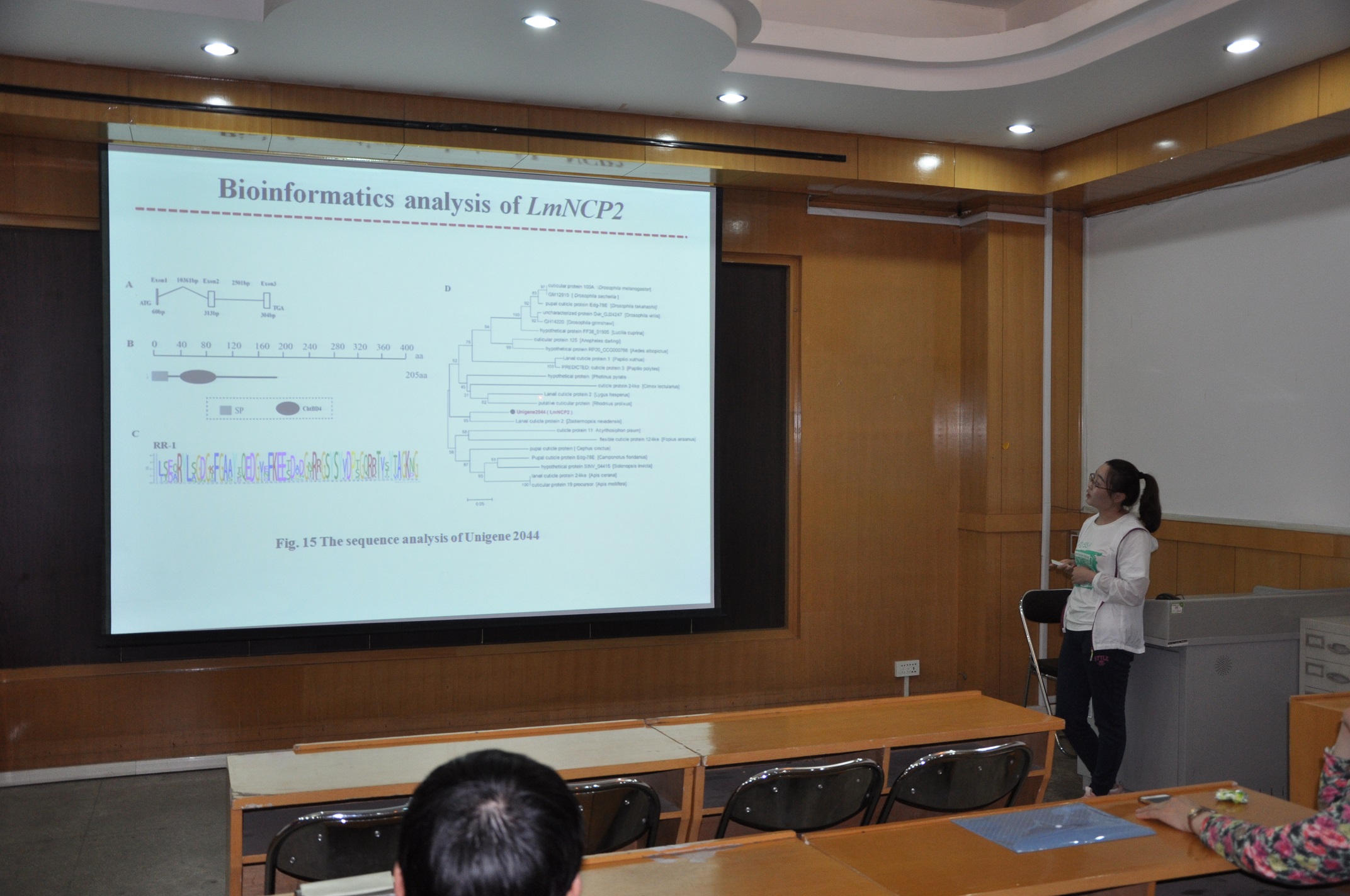 之后,史学凯和杨亚亭同学分别围绕“飞蝗dsRNA 的吸收机制研究”和“飞蝗内表皮蛋白基因功能研究”的研究背景、实验进展和本学期的工作计划进行了汇报。在座师生对两位同学的报告进行了点评,并提出具体建议,对其下一步的研究工作具有重要的指导意义,也对低年级的同学起到了引导作用。